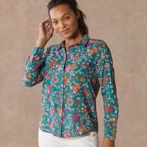 Cheerful floral print on our soft top with patch pockets. back yoke and button cuffs. Cotton. Machine wash. Imported. Exclusive. Sizes XXS (00). XS (0-2). S (4-6). M (8-10). L (12-14). XL (16-18). Approx. 24.5l.