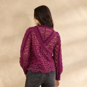 Luxurious allover lace adds elegance to every step of our detailed crocheted top with bold sleeves. scalloped bottom and so much texture. Invisible button closure at the back. Camisole included. Polyester/cotton/modal. Hand wash. Imported. Exclusive. Sizes XS (0?C2). S (4?C6). M (8?C10). L (12?C14). XL (16?C18). XXL (20?C22). Approx. 23.5l.