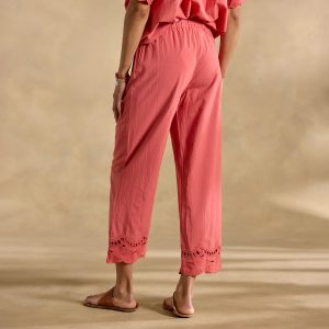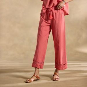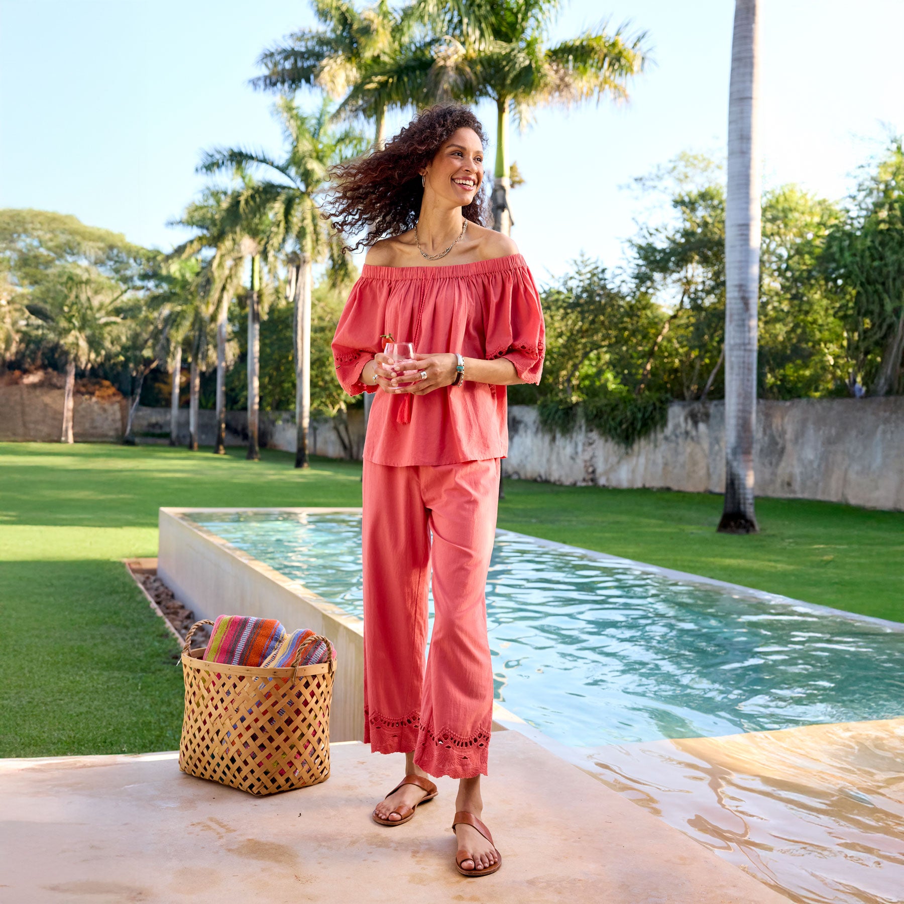 Easy. breezy cropped pants embellished with cut-out detailing and embroidery at hem. Smocked. elastic waistband with braided ties. Cotton. Machine wash. Imported. Sizes XS (4). S (6). M (8–10). L (12). XL (14). XXL (16). 26 inseam.