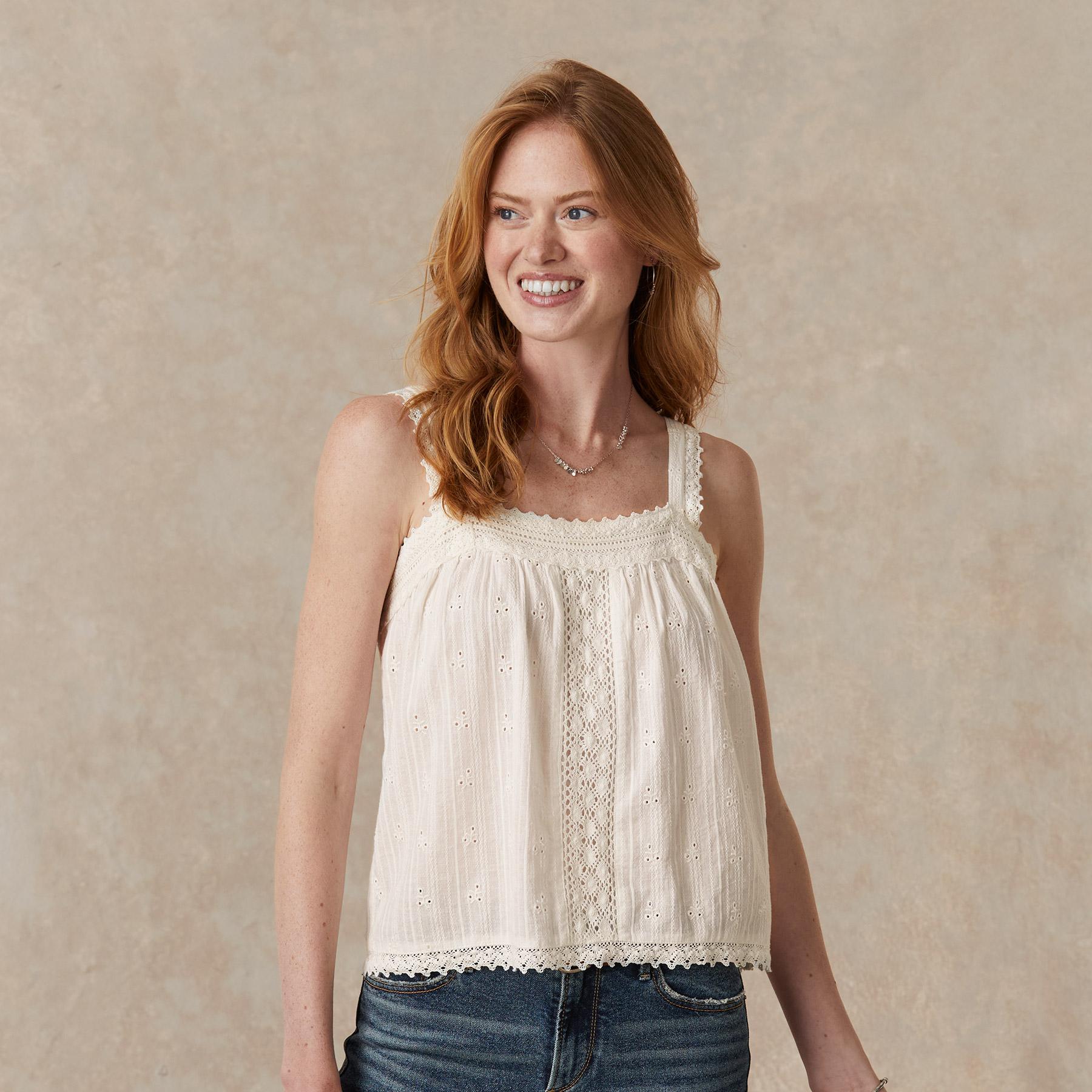 Vintage-inspired. oh-so-feminine camisole with beautiful tonal embroidery and lace details at neckline and front. Adjustable straps and elastic at back neck for comfortable fit. Cotton/viscose. Machine wash. Imported. Exclusive. Sizes XS (0?C2). S (4?C6). M (8?C10). L (12?C14). XL (16?C18). XXL (20?C22). Approx. 25l.
